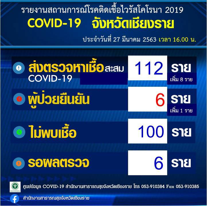 เมื่อวันที่ 28 มี.ค.นี้ ศูนย์ปฏิบีติการตอบโต้ภาวะฉุกเฉินทางการแพทย์และสาธารณสุข สำนักงานสาธารณสุข จ.เชียงราย แจ้งว่า จ.เชียงราย มีการพบผู้ป่วยติดเชื้อไวรัสโควิด-19 เพิ่มเติมอีก 1 ราย ทำให้มียอดผู้ป่วยที่พบในพื้นที่รวมกันแล้วทั้งสิ้นจำนวน 6 ราย โดยรายแรกเป็นชายอายุ 35 ปี มีการให้ข้อมูลว่าเดินทางกลับจากกรุงเทพฯ หลังไปเที่ยวที่เมืองปอยเปต ประเทศกัมพูชา และกลับบ้านที่ อ.เทิง ก่อนจะมีมารดาของภรรรยาอายุ 58 ปี ติดเชื้อเพิ่มเป็นรายที่ 2 ส่วนผู้ป่วยรายที่ 3 เป็นชายอายุ 33 ปีพบที่ อ.แม่จัน