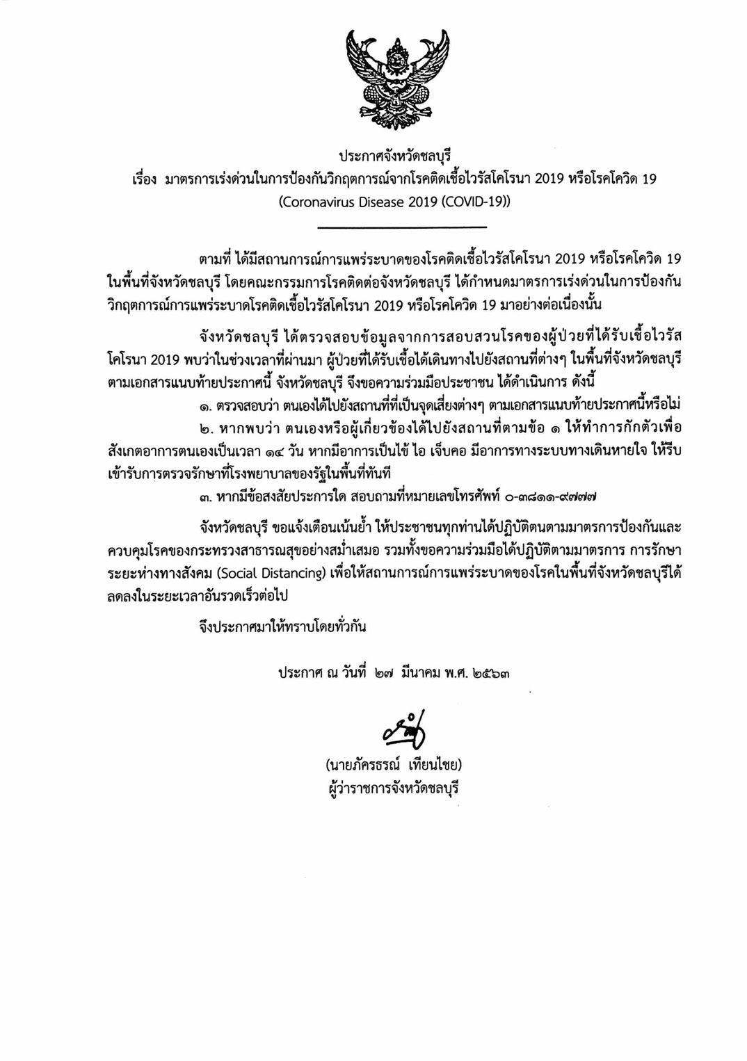 วันที่ 28 มีนาคม 2563 จังหวัดชลบุรีได้ออกประกาศ มาตรการเร่งด่วนในการป้องกันวิกฤตการณ์จากโรคติดเชื้อไวรัสโคโรนา 2019 หรือโรคโควิด-19 โดยคณะกรรมการโรคติดต่อจังหวัดชลบุรี ได้กำหนดมาตรการเร่งด่วนในการป้องกัน วิกฤตการณ์การแพร่ระบาดโรคติดเชื้ไวรัสโควิด-19 มาอย่างต่อเนื่องนั้น