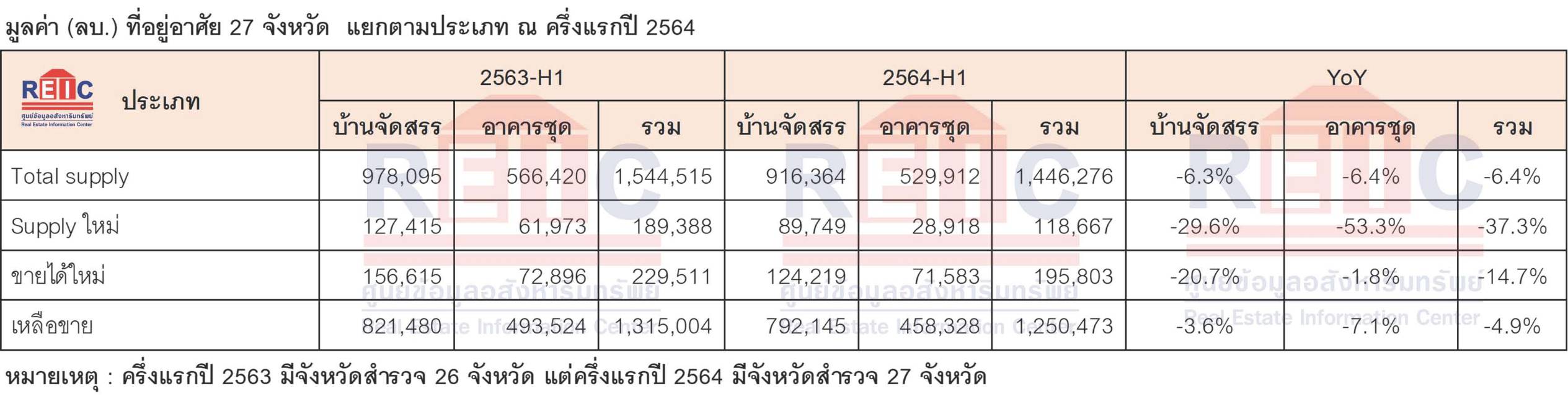 ทั้งนี้ การปรับตัวลดลงของอุปทานที่อยู่อาศัยเข้าใหม่เช่นนี้ ส่งผลต่อภาพรวมของอุปทานที่อยู่อาศัยทั้งหมดที่มีการขายในตลาดพื้นที่ 27 จังหวัด ณ ครึ่งปีแรกปี 2564 มีจำนวนทั้งสิ้น 328,657 หน่วย มูลค่ารวม 1,446,276 ล้านบาท จำนวนหน่วยลดลงร้อยละ -5.7 มูลค่าลดลงร้อยละ -6.4 เมื่อเทียบกับช่วงเดียวกันของปี 2563 แสดงให้เห็นถึงกลยุทธ์การปรับตัวของผู้ประกอบการพัฒนาที่อยู่อาศัยที่ไม่เพิ่มเติมสินค้าใหม่เข้ามาในตลาดมากนัก แต่จะเน้นการระบายสินค้าเดิมที่มีอยู่ออกไป เพื่อสร้างสภาพคล่องในการบริหารจัดการ