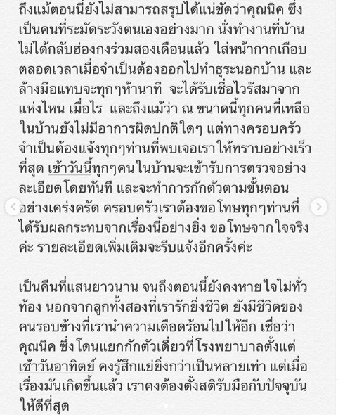 คุณน้ำทิพย์ระบุว่า เป็นคืนที่แสนยาวนาน จนถึงตอนนี้ยังคงหายใจไม่ทั่วท้อง นอกจากลูกทั้งสองที่เรารักยิ่งชีวิต ยังมีชีวิตของคนรอบข้างที่เรานำความเดือดร้อนไปให้อีก เชื่อว่าคุณนิค ซึ่งโดนแยกกักตัวเดี่ยวที่โรงพยาบาลตั้งแต่เช้าวันอาทิตย์ คงรู้สึกแย่ยิ่งกว่าเป็นหลายเท่า แต่เมื่อเรื่องมันเกิดขึ้นแล้ว เราคงต้องตั้งสติรับมือกับปัจจุบันให้ดีที่สุด ณ เวลานี้ครอบครัวเราได้โทรแจ้งทุกที่ และทุกท่านที่มีส่วนเกี่ยวข้องเรียบร้อยแล้วค่ะ ขอโทษอีกครั้งจากใจค่ะ
